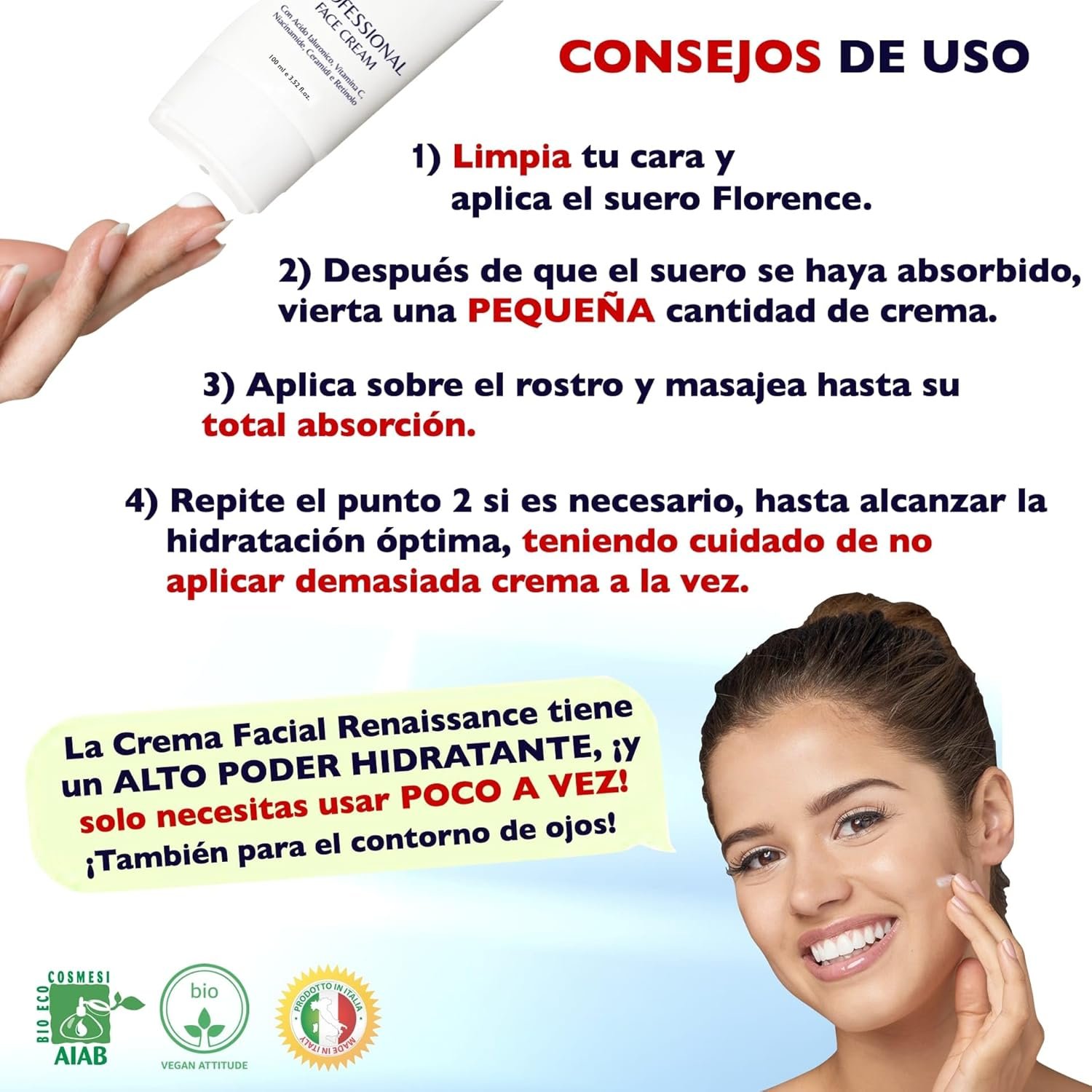 LA DIFERENCIA DE NUESTRO PRODUCTO DE PRIMERA CALIDAD: nuestra crema MADE IN ITALY, y contiene ingredientes de agricultura ecológica italiana con acción anti edad. Su fórmula, enriquecida con Ácido Hialurónico, Vitamina C, Niacinamida, Retinol, Glicerina Vegetal, Aloe Vera, Vitamina E, Retinol, Ceramidas, Péptidos Elastina y Ácido Salicílico hidrata y nutre en profundidad las capas subcutáneas de la piel, tratando las líneas de expresión del rostro- ¡la alternativa natural al botox!