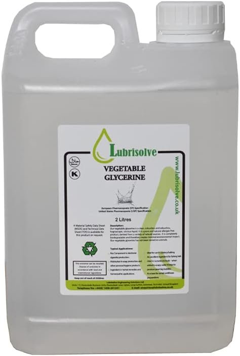 2 litros de GLICERINA VEGETAL EP/USP GRADO ALIMENTARIO / COSMÉTICO DE CALIDAD SUPERIOR PURA Y NATURAL – biodegradeable y sin alérgenos. Farmacopea Europea (EP) / Farmacopea de los Estados Unidos (USP) especificación. CONTENIDO DE GLICERINA (MIN 99,8%). Cumple con los requisitos para ser utilizado como aditivo alimentario (E422) * Suministrado por nuestros expertos de la industria * Nuestra glicerina vegetal es un líquido viscoso transparente, incoloro e inodoro, higroscópico, con una pureza mínima del 99.8%. Es un producto puro y natural sin alérgenos, derivado de una variedad de fuentes naturales. Es completamente biodegradable y, por lo tanto, crea un impacto ambiental mínimo. Nuestra glicerina vegetal no ha sido probada en animales. Nuestra glicerina vegetal también se produce SIN el uso de materias primas procedentes de la planta de Jatropha o sus aceites (la planta de Jatropha está clasificada como una hierba nociva en algunos países; el aceite producido a partir de la planta de Jatropha contiene sustancias cancerígenas y presenta un riesgo significativo para la salud humana y animal) Sinónimos: Glicerina, Glicerina, Glicerol, 1,2,3 propano triol, Trihidroxipropano Especificaciones: Especificación de la Farmacopea Europea (EP). Especificación de la farmacopea de los Estados Unidos (USP). Cumple con los requisitos para ser utilizado como aditivo alimentario (E422). Halal y Kosher aprobados. Aplicaciones típicas · Componente clave en la producción de cigarrillos electrónicos. · Hidratante en la producción de jabón y otros productos de higiene personal. · Ingrediente en remedios herbales y aplicaciones homeopáticas. · Ideal para usar en cocinar / hornear. · Un excelente ingrediente para cebo de pesca. Utilizado en guarderías / escuelas: cuando se agrega al agua jabonosa, ayuda a producir grandes burbujas grandes. Como base para ciertas preparaciones anticongelantes.