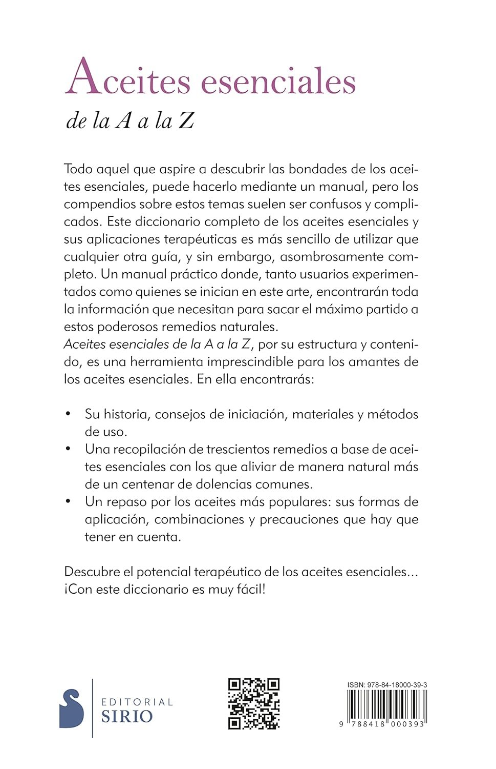Todo aquel que aspire a descubrir las bondades de los aceites esenciales, puede hacerlo mediante un manual, pero los compendios sobre estos temas suelen ser confusos y complicados. Este diccionario completo de los aceites esenciales y sus aplicaciones terapéuticas es más sencillo de utilizar que cualquier otra guía, y sin embargo, asombrosamente completo. Un manual práctico donde, tanto usuarios experimentados como quienes se inician en este arte, encontrarán toda la información que necesitan para sacar el máximo partido a estos poderosos remedios naturales. Aceites esenciales de la A a la Z, por su estructura y contenido, es una herramienta imprescindible para los amantes de los aceites esenciales. En ella encontrarás: – Su historia, consejos de iniciación, materiales y métodos de uso. – Una recopilación de 300 remedios a base de aceites esenciales con los que aliviar de manera natural más de un centenar de dolencias comunes. – Un repaso por los aceites más populares: sus formas de aplicación, combinaciones y precauciones que hay que tener en cuenta. Descubre el potencial terapéutico de los aceites esenciales… ¡Con este diccionario es muy fácil!