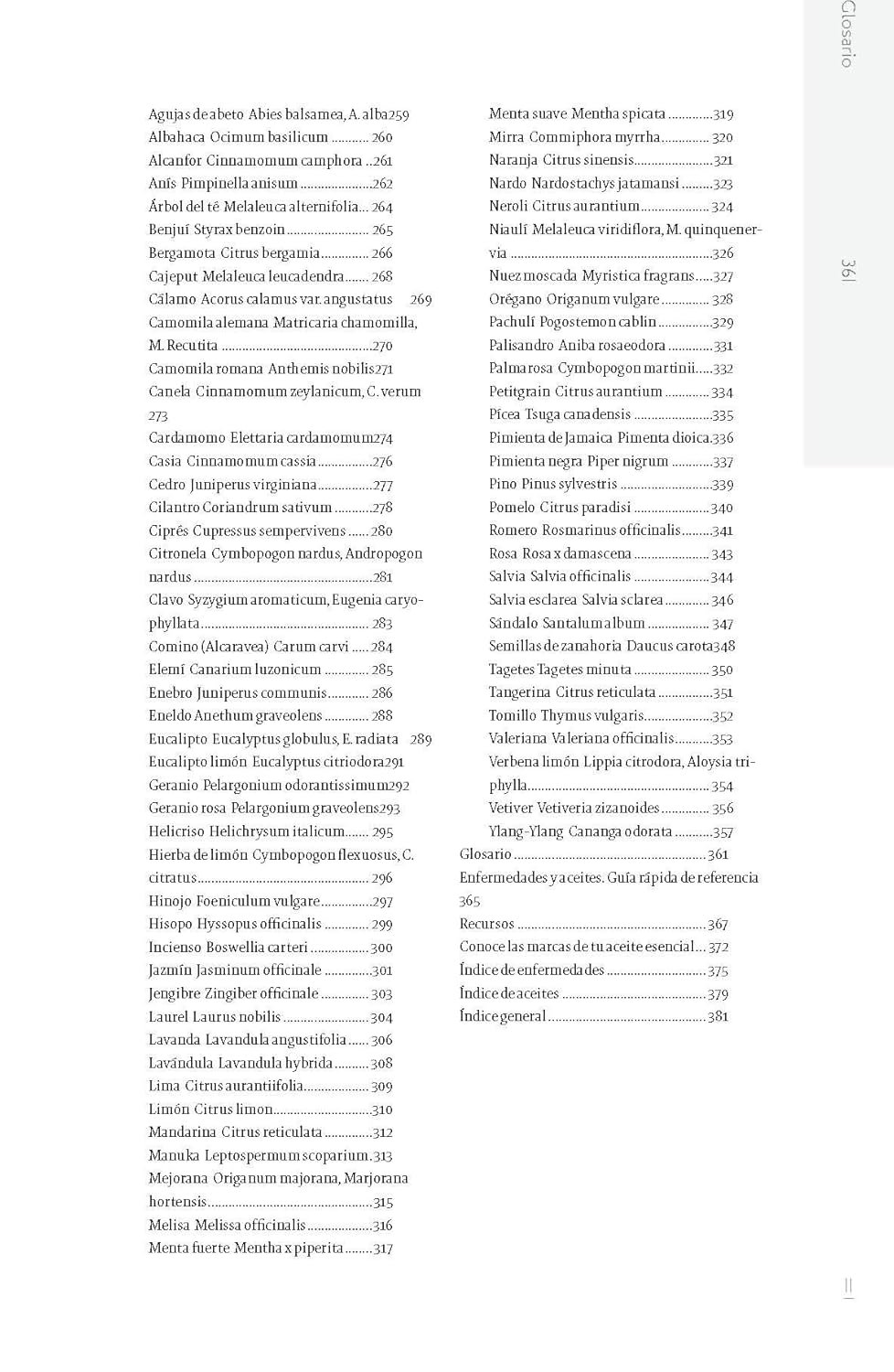 Lo acabo de empezar a leer y me esta encantando! Un manual muy fácil de entender, tiene consejos de iniciación a los aceites esenciales (combinaciones y precauciones) métodos de uso, recopilación de remedios para aliviar un montón de dolencias y repaso a los aceites esenciales más populares. Pensé que solo hablarÃan de que es cada aceite esencial, pero no es asà es muy completo en mi opinión. Muy recomendable. Medidas 15 x 22,8 cm y 381 páginas.