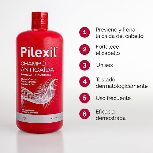 Y es que por eso se compra, para que lo débil no se pierda sino que se quede para siempre. Esto que parece sacado de las Sagradas Escrituras es la verdad que ellos mismos asumen en una de sus respuestas, diciendo: «Es normal perder el pelo que de todas formas iba a caer». Lo que uno espera es que esa raíz debilitada vuelva a regenerarse con otro cabello esta vez fuerte gracias al uso de Pilexil.Perdí mucho pelo fino durante su aplicación, llevo un mes. Ese pelo débil que ves caer sobre la frente, que es más pequeño que el resto y que, como si quisiera crecer, no puede y termina en la bañera o en la almuhada. Las primeras veces que usé este champú, caían hasta casi veinte pelos finos y pepeños cada vez que me lavaba la cabeza. Vale, estoy en los casi cincuenta y ya le tocaba, pero ahora se ve el cuero cabelludo como nunca antes, también después de secado. Es lo que el espejo me dice.El pelo coge cuerpo con Pilexil, parece más brillante, el cabello largo parece que no se cae tanto, permanece en su sitio pero sigues viéndolo en la bañera después de ducharte y lavarte la cabeza masajeandola con este producto unos dos minutos. La propaganda televisiva recomiendo usarlo con los primeros síntomas de pérdida. Lo combino con gotas enriquecedoras y cuando no lo uso, en días alterno, aplico una crema anticaída.CONCLUSIÓN: Me preocupa este champú. No creo en las conclusiones más o menos ciéntificas que nos dicen. Me pregunto: Bien, dejaís que caiga el pelo débil para fortalecer el sano… ¿Y lo siguiente qué es? ¿Qué pasa con el pelo sano? Un día su raíz se debilitará y el cabello se convertirá en pelo fino que el Pilexil hará caer. Pasarán cinco, diez o veinte años… Pero mi impresión es que causará con el tiempo calvicie prematura.NO RECOMIENDO SU USO.NO LO COMPRÉIS.Ya estoy buscando otras opciones más caras. No quiero volver a echarlo sobre mi cabeza. Dinero y pelo, muchos pelos perdidos y calvicie incipiente. Eso me hé ganado. Nunca ví tan claro mi cuero cabelludo. Ya brilla con los alógenos!!!Lo más cierto es que cada vez que he dejado un diente picado se me ha caído mucho pelo. Lo quise evitar yendo más al dentista, pero esta últimavez tenía una caries en un incisivo sin saberlo ni dolerme. Había sido quitado el nervio hacía años. Cuando se me cayó un poco de esmalte había pasado casi un año dejando la almohada llena de pelos cada mañana. Mi dentista recupeó el diente quitando todo su interior, que estaba podrido. La sustancia que va desprendiendo es absorvida a través del intestino convirtiéndose en un tóxico que pone de mal humor, da dolor de cabeza y hace caer el pelo. Mi experiencia debería servirte para cuidar tu dentadura primero pra luego ver que ahorrarás con productos como este. Mira por tu futuro. La calvicie no le queda bien a todo el mundo.Las dos estrellas es porque limpiar limpia, hace mucha espuma con poca cantidad y huele bien.