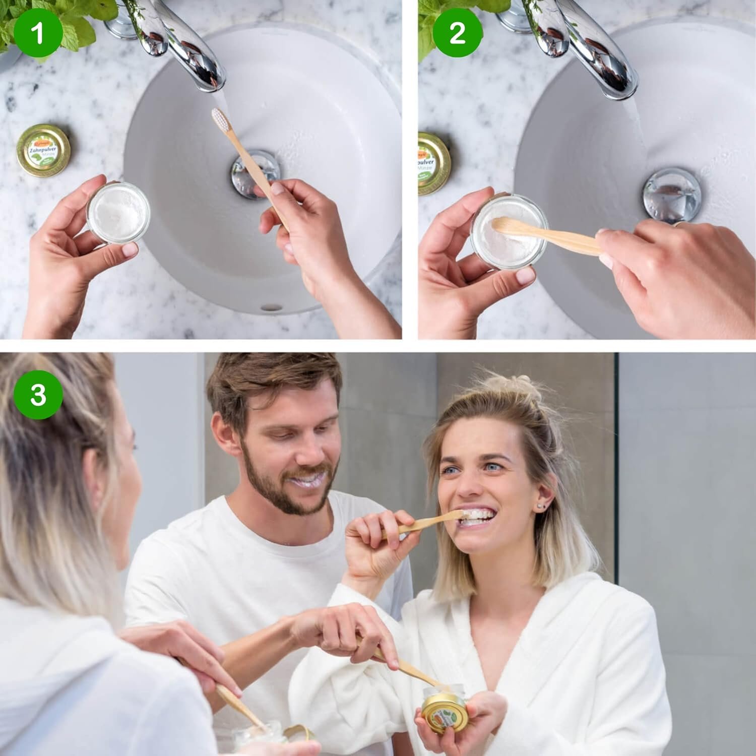 Aplicación: simplemente presiona el cepillo de dientes ligeramente húmedo en el polvo de dientes, el polvo permanece pegado al cepillo de dientes. Para cepillarse los dientes como de costumbre.