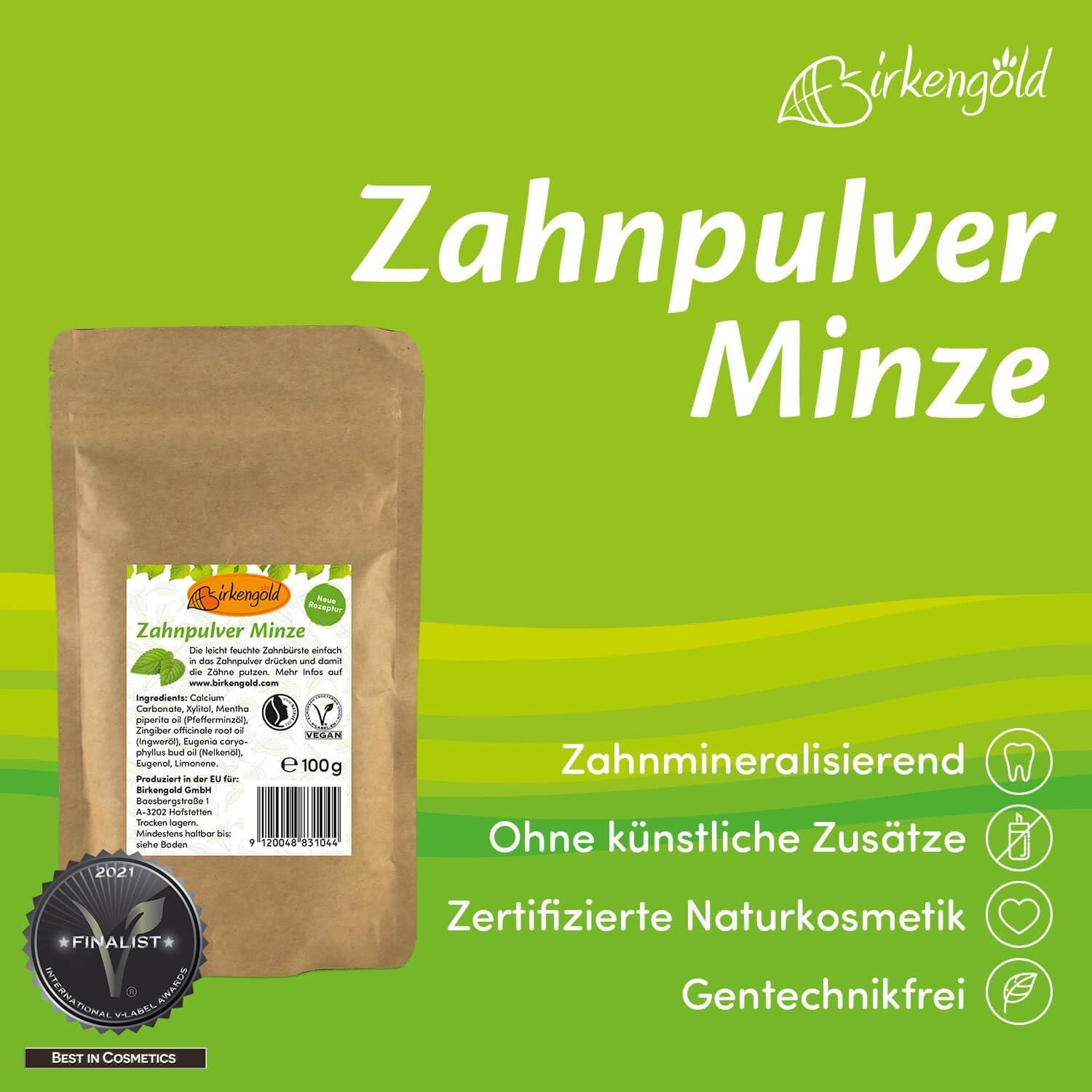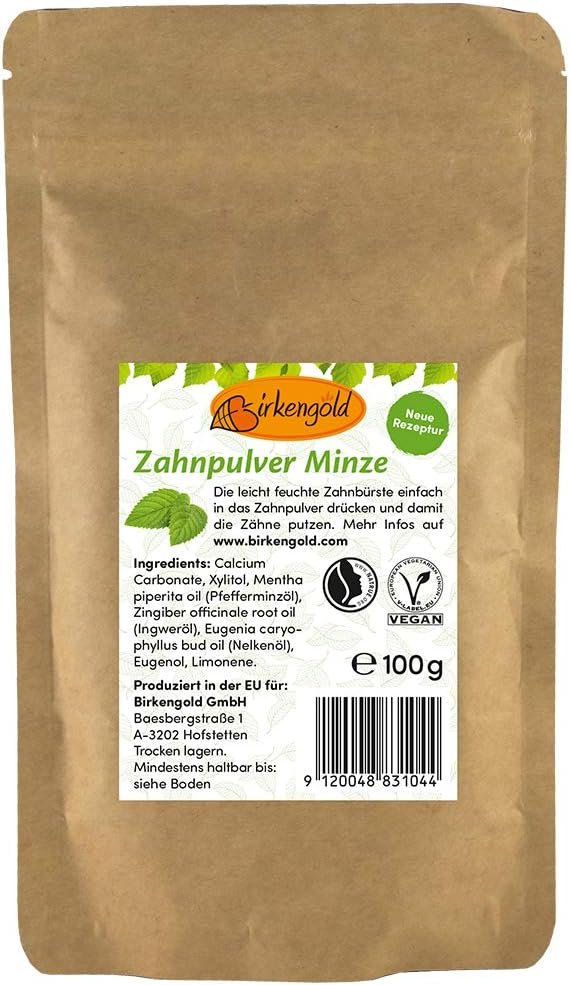 Birkengold Bolsa de recambio de menta en polvo de dientes 100 g | Protege El esmalte | Ingredientes 100% naturales | Sin espumantes Y conservantes | Cosméticos naturales | Vegano