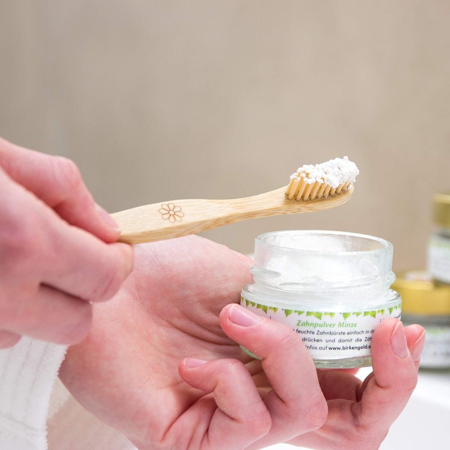 El producto de cuidado dental probado recientemente redescubierto! La mezcla de carbonato de calcio, abedul xilato dorado y aceites esenciales limpia suavemente los dientes y proporciona un ambiente básico en la boca. Por lo tanto, el crecimiento de caries y bacterias periodontales en la boca se inhibe de manera sostenible. Aplicación: simplemente presiona el cepillo de dientes ligeramente húmedo en el polvo de dientes, el polvo permanece pegado al cepillo de dientes. Para cepillarse los dientes como de costumbre. Fabricado sin ingeniería genética. Condiciones de almacenamiento vegano: almacenar seco y bien cerrado. Nos hemos asegurado de que usamos carbonato de calcio con un tamaño de partícula muy pequeño para obtener un valor RDA bajo (aproximadamente 45) alcanzar. Sin embargo, además del tamaño de partícula del cuerpo de yeso son responsables de la abrasión, el cepillo de dientes utilizado (suave, medio o duro), así como también otros factores, como por ejemplo la fuerza de compresión durante la limpieza y también la técnica de limpieza.