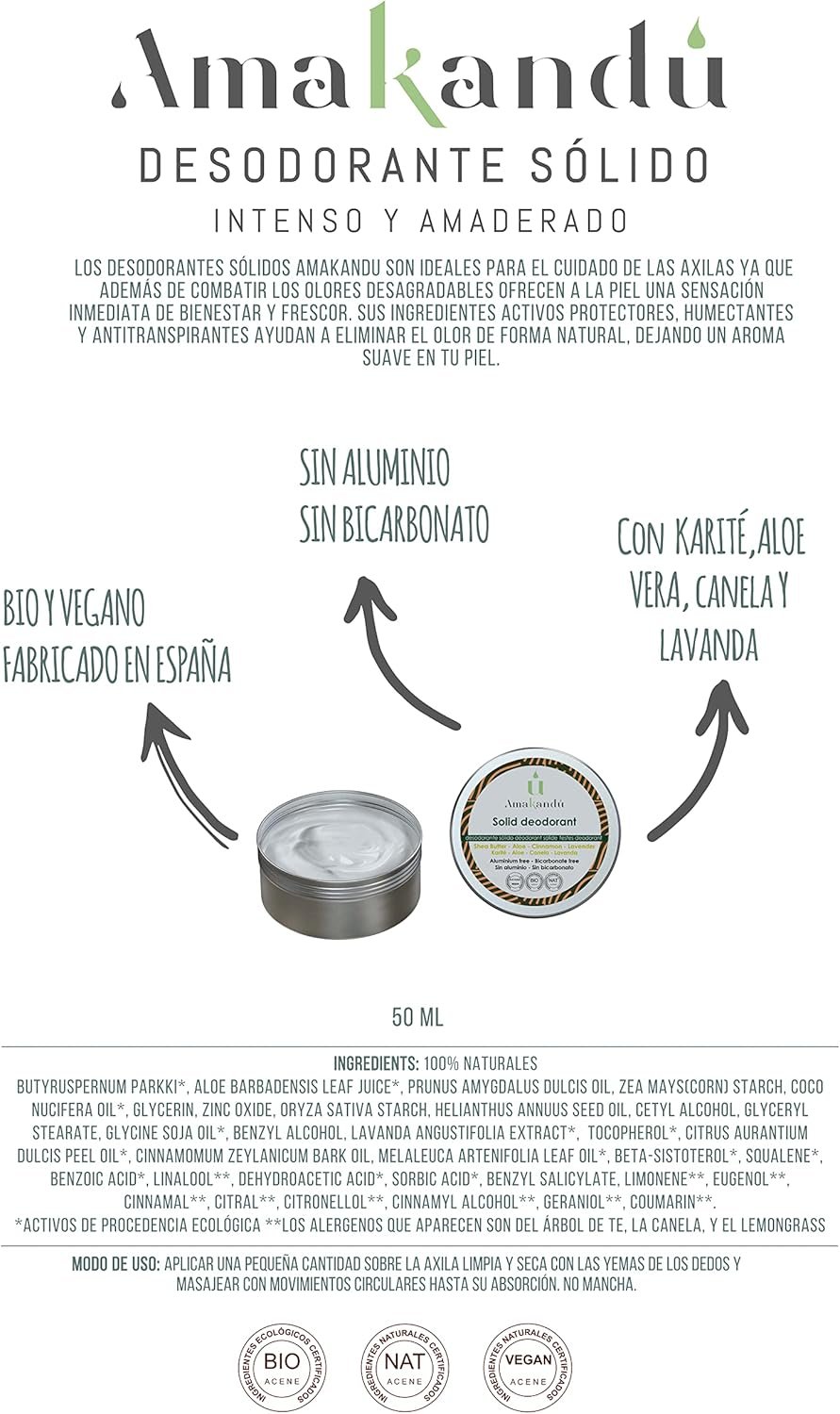 🌿 INGREDIENTES ECOLÓGICOS CERTIFICADOS: Este Desodorante Amakandu está elaborado con ingredientes naturales y veganos. No esta testado en animales. No contiene aluminio ni bicarbonato sin microplásticos sin nanopartículas, sin productos químicos. Certificado por ACENE NAT y VEGAN.