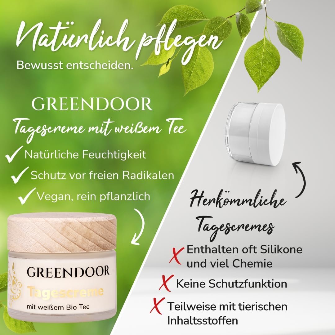 Greendoor Crema de día con té blanco, 50ml, protección reafirmante natural Cuidado de día sin Brillo graso, Cosmética natural Calidad de fabricación, Crema facial, crema para la Cara