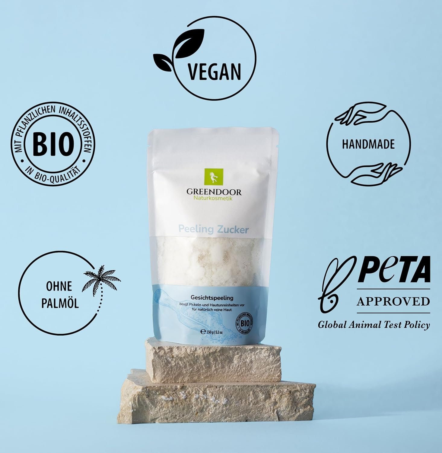 Greendoor Peeling Azúcar, Peeling facial para Cara, Cuello, Escote & especialmente piel sensible, 150g, unscented = sin Perfume, sin conservantes, Cosmética natural