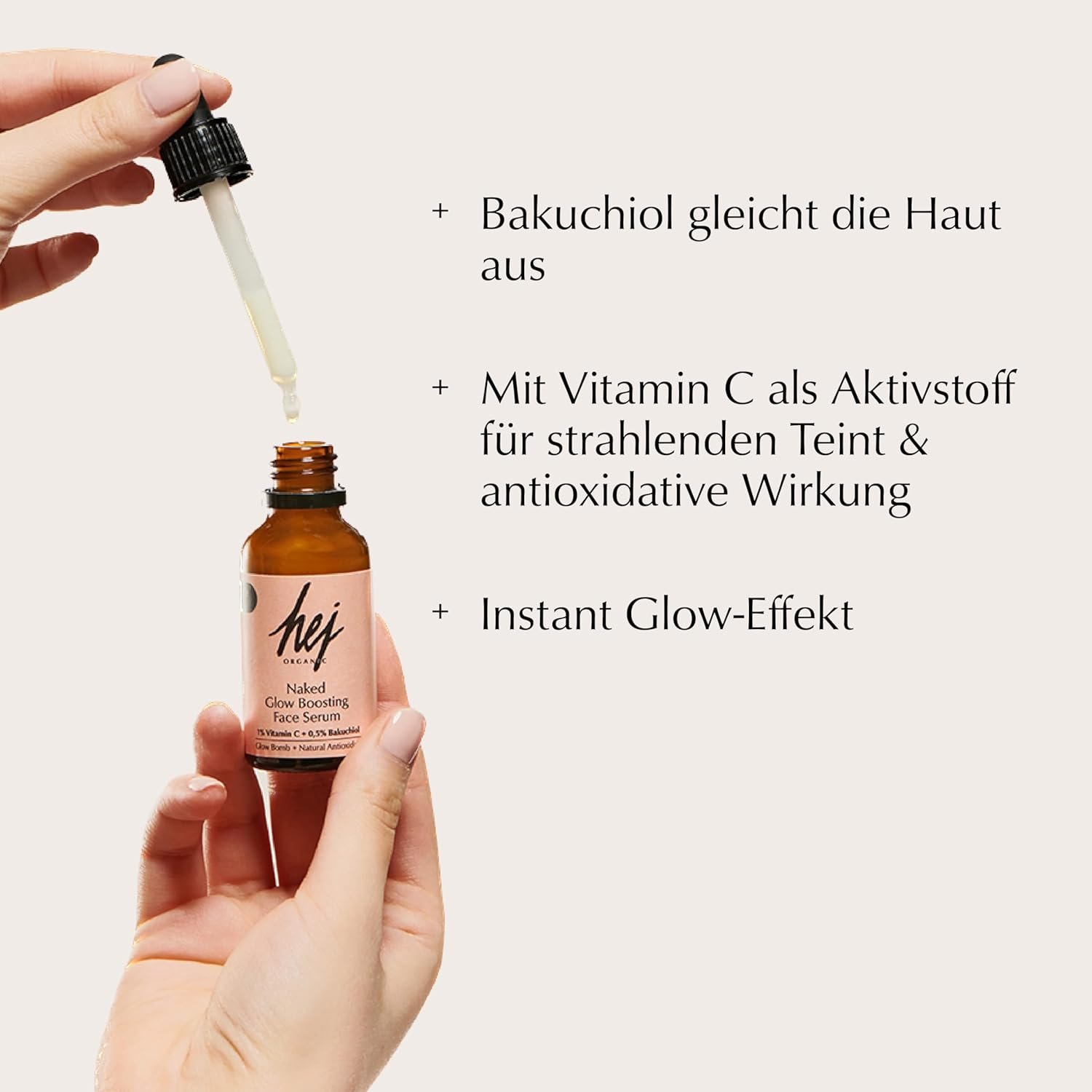 Das Glow Boosting Face Serum von HEJ ORGANIC hat mir durch seinen sofortigen Glow-Effekt und die hautfreundlichen Eigenschaften für unreine, ölige und Mischhaut gut gefallen. Das Serum wirkt nicht nur effektiv, sondern ist auch eine natürliche Kosmetikoption.Der Sofort-Glow-Effekt des Serums verleiht der Haut einen strahlenden Teint, der die natürliche Schönheit betont. Dies ist besonders gut für Menschen mit unreiner, öliger oder Mischhaut geeignet, weil es den Teint verbessert und Rötungen vorbeugt.Die beruhigende Wirkung des Serums macht es auch für Personen mit empfindlicher Haut und Hautunreinheiten zu einer idealen Wahl. Die natürlichen Inhaltsstoffe beruhigen die Haut und fördern ein gesundes Hautbild. Die Verwendung von natürlicher Kosmetik und der vollständig vegane Ansatz zeigen HEJ ORGANICs Engagement für nachhaltige und umweltfreundliche Produkte. Die hochwertige Verpackung des Serums spiegelt zusätzlich dessen Premiumqualität wider.Durch die leichte Textur zieht das Serum schnell in die Haut ein, ohne einen fettigen Film zu hinterlassen.
