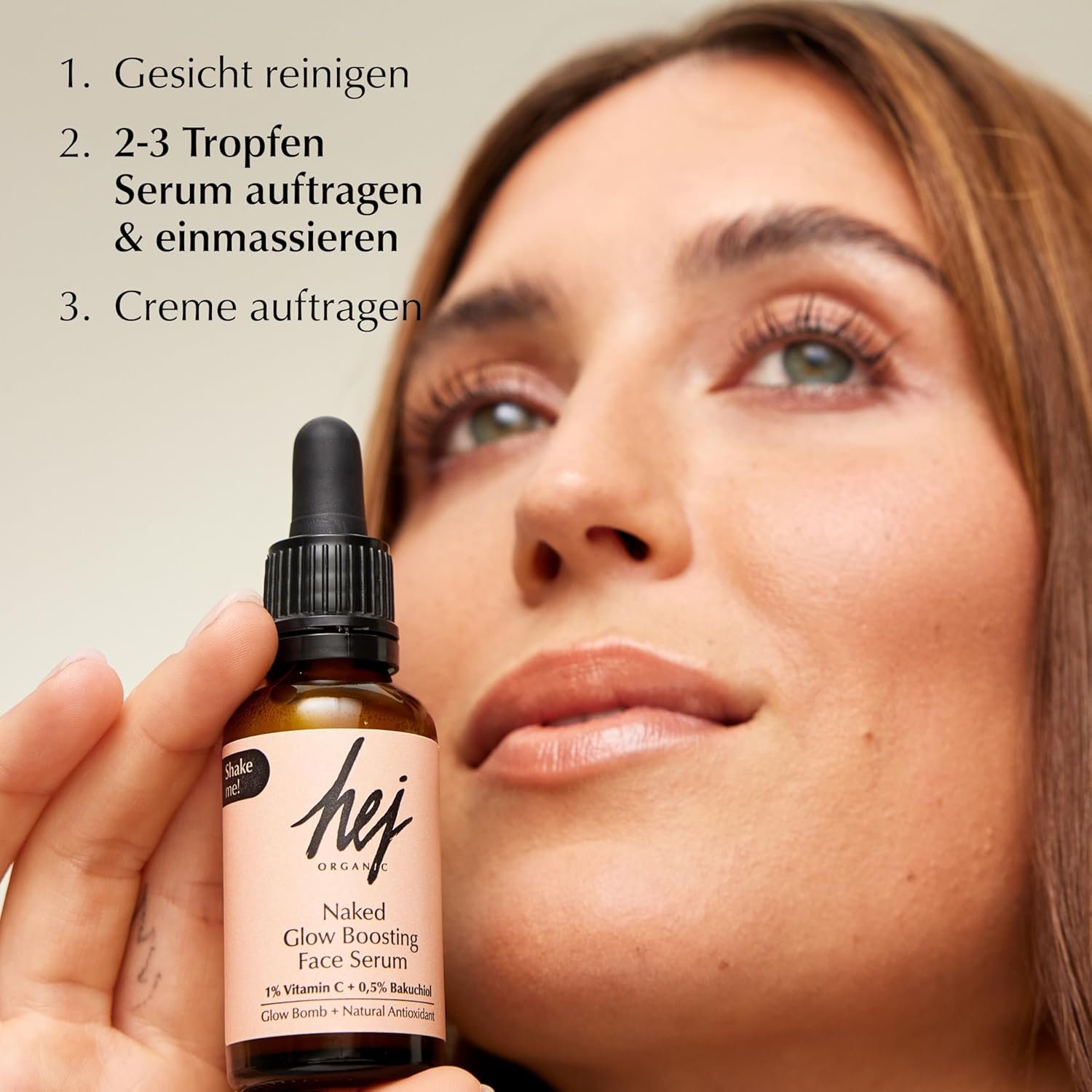 Das Glow Boosting Face Serum wurde schnell geliefert und kam gut verpackt und unbeschädigt bei mir an.Im Karton befindet sich eine braune Glas-Pipettenflasche die das Serum vor Licht schützen soll. Die Flasche hat ein Frischesiegel das man erstmal öffnen muss, so hat man die Garantie das es nicht vorher schon angebrochen wurde. Das Serum riecht nur ganz zart nach Pflanzen, ist leicht milchig, etwas dickflüssig, aber lässt sich wunderbar mit der Pipette dosieren. Auf der Haut lässt es sich sehr gut verteilen, es wirkt im ersten Moment frisch und feuchtigkeitsspendend und zieht dann sehr schnell ein. Es hinterlässt auf der Haut ein gepflegtes Gefühl, ohne zu fetten oder zu spannen.Die beruhigende Wirkung des Serums macht es auch für Personen mit empfindlicher Haut und Hautunreinheiten zu einer idealen Wahl. Die natürlichen Inhaltsstoffe beruhigen die Haut und fördern ein gesundes Hautbild. Die Verwendung von natürlicher Kosmetik und der vollständig vegane Ansatz zeigen HEJ ORGANICs Engagement für nachhaltige und umweltfreundliche Produkte