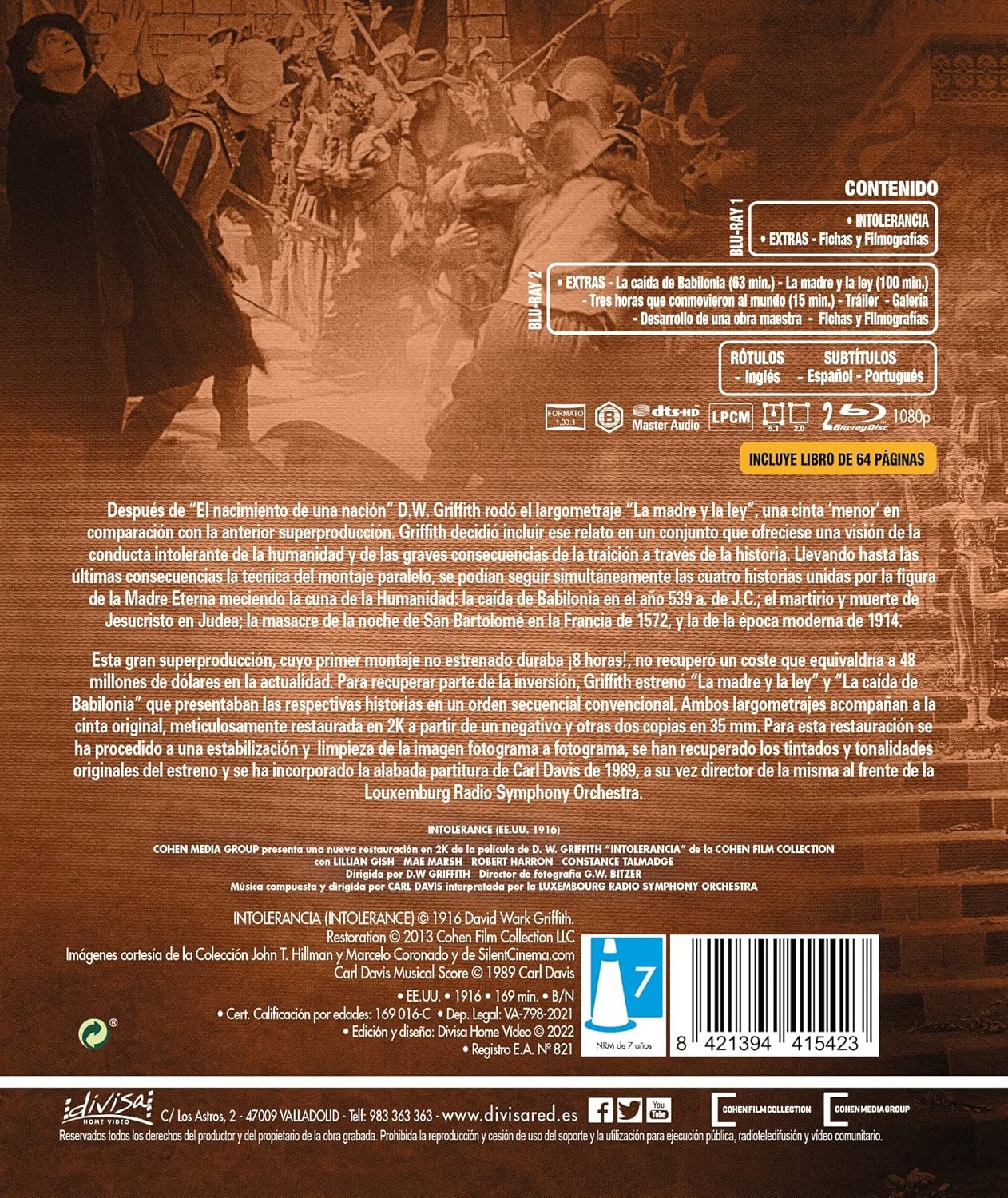 Comentasrio a la edición española en BD. Para una producción de 1916, una calidad de imagen muy buena. Una observación importante: la duración es menor que la edición en DVD, pero no es porque la pelÃcula esté recortada, sino porque se ha variado la velocidad de proyección. Podéis encontrar más datos sobre esto en la página blu-ray.com y buscar «Intolerance» (la página está en inglés).En el Disco 2 se pueden disfrutar de forma independiente 2 de las historias que componen el film principal, sin restaurar ni tintar, que sirven además para contrastar el trabajo de restauración realizado con «Intolerancia».Por lo demás, una de las mejores pelÃculas de la historia del cine y con un importante mensaje moral atempooral, aunque muy pocos lo practiquen (asà nos va).