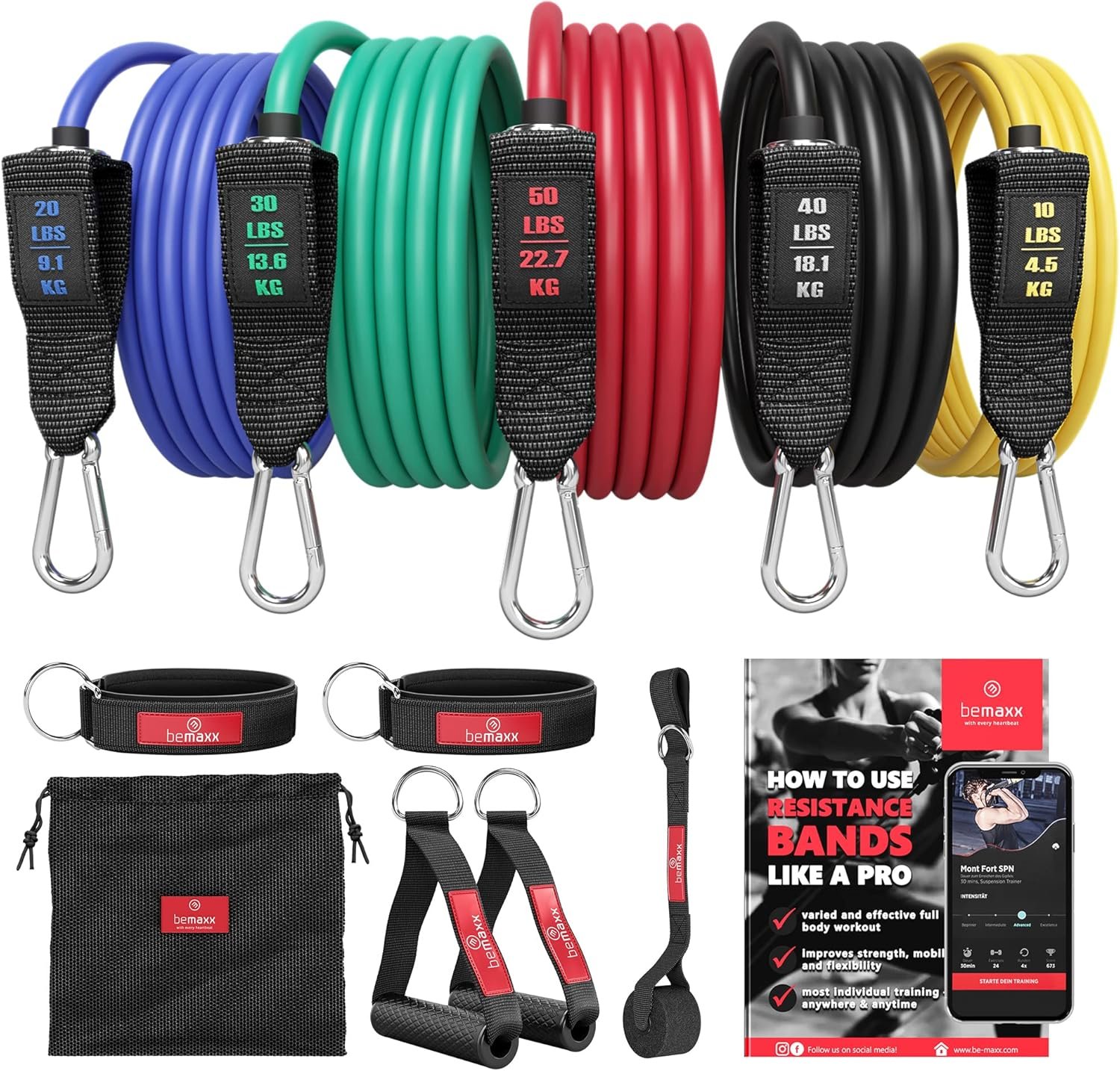 I’ve used the rubber tube versions of resistance bands for years. These are far superior. The quality of all the materials of the various pieces – from the bands and handles to the door anchor and ankle straps – is top notch. I love the fabric bands over the rubber tubes. Much more comfortable when standing on them for certain exercises, and much nicer on the skin if they rub across your body when doing presses. Love that the bands are numbered for the ‘weight’ you’re lifting, and they they provide a higher level of resistance than the tubes. The main selling point for me was the replacement bands; I couldn’t find any company that just sold the band without having to buy the whole kit. With this kit, you can buy individual bands from BeMaxx to replace worn out ones or add more weight. Simply, the best bands I’ve ever used. Worth the higher price. Only downside: if you’re using them to workout while traveling, they are a bit heavier in your suitcase. Not a deal breaker. Still 5 stars.