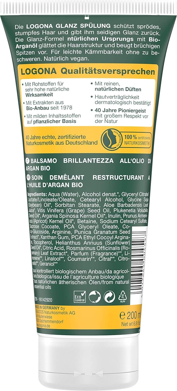 La Logona Acondicionador Brillo Bio de argán protege sprödes, stumpfes del cabello y le da brillo extra. la fórmula de brillo natural con aceite de argán de bio, bio de albaricoque y bio aceite de Inca Inchi y natural de betaína nutren el cabello suave suave y optimiza la estructura del cabello natural. valor plena aceites naturales proporcionan kämmbarkeit ligero, alisar el cabello y brüchigen puntas del cabello prevenir la textura cremosa proporciona un sentimiento de pelo de lockeres sin quejarse.