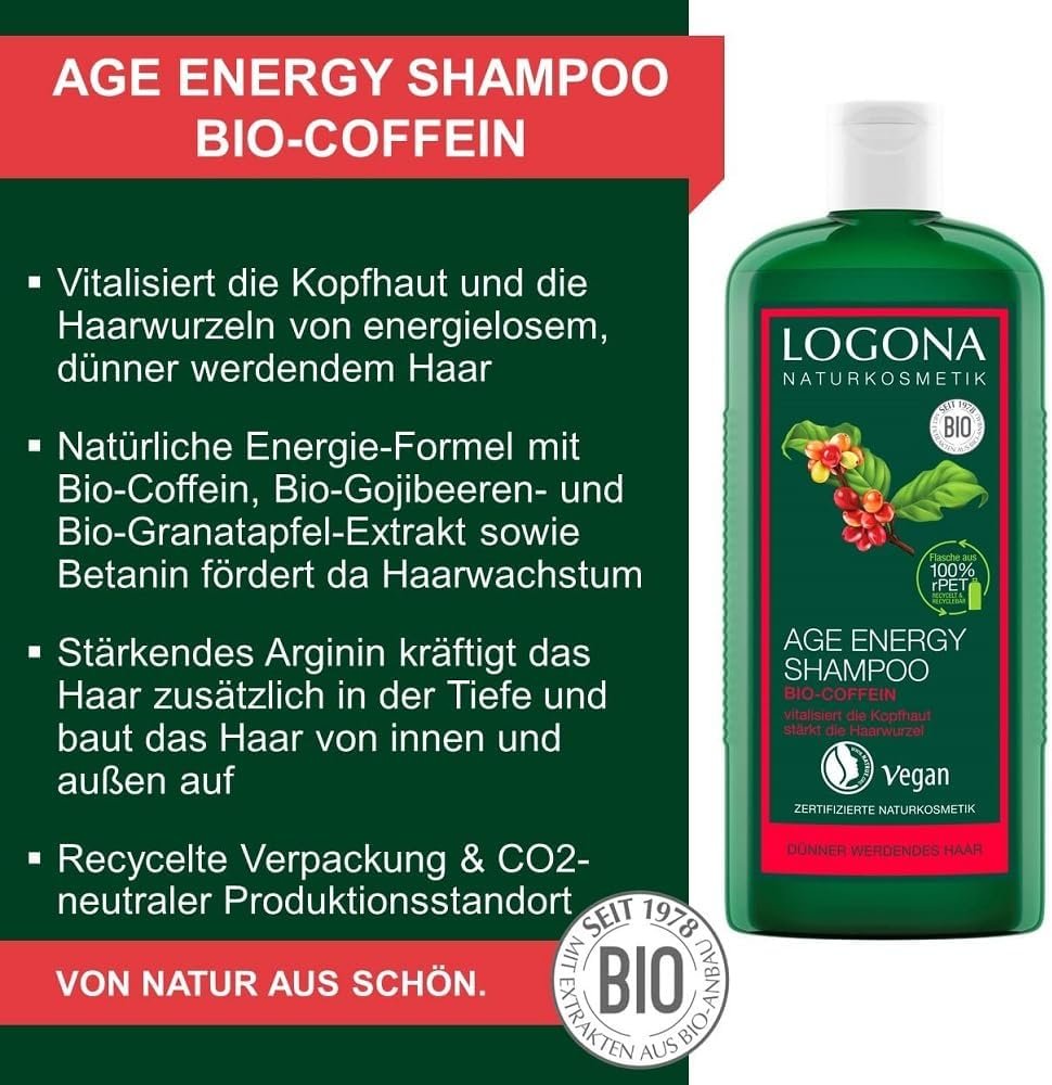 LOGONA Naturkosmetik Champú vitalizante para cabello naturalmente fuerte, adecuado para cabello sin energía, adelgazante, champú para el cabello Age Energy con fórmula vegana de cafeína orgánica, 1 x 250 ml