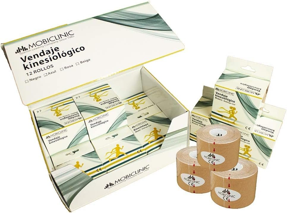 Mobiclinic®, Pack 12 uds. Kinesiotape, Venda neuromuscular adhesiva, Rollos de 5 m x 5 cm, Esparadrapo deportivo, Alivio dolor muscular, Vendaje kinesiológico, Cinta kinesiológica, Face Tape, Beige.