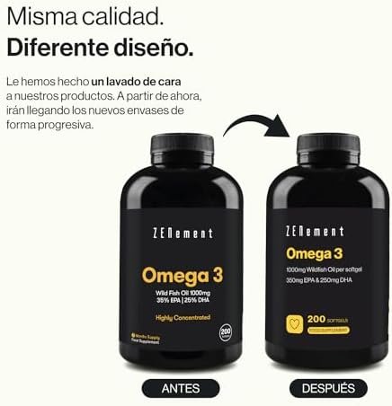 Acerca de este producto 🐟 ¿POR QUÉ ELEGIR EL ACEITE DE PESCADO OMEGA 3 DE ZENEMENT?: Nuestro Omega 3 se extrae de manera responsable de peces salvajes en la costa del Perú, específicamente de anchoas. Cuenta con la certificación de Friend of the Sea, un programa internacional que evalúa la sostenibilidad de los productos pesqueros. Utilizamos aceite de pescado salvaje de la más alta calidad, sin contaminantes, conservantes ni colorantes. Beneficios adicionales incluyen ácidos grasos Omega 3 EPA y DHA. ⭐ ¡BENEFICIOS PARA TU BIENESTAR!: Nuestro suplemento de omega 3 2000 mg te brinda dosis diarias potentes de ácidos grasos esenciales. Los ácidos eicosapentaenoico y docosahexaenoico contribuyen al funcionamiento normal del corazón, el cerebro y la visión. Respaldado por la EFSA. Mejora tu calidad de vida con nuestras perlas de omega 3 epa y dha. 💥 ¡FÓRMULA OPTIMIZADA DE OMEGA-3 ZENEMENT! Cada cápsula de gelatina blanda contiene 1000 mg, sumando un total de 2000 mg por dosis diaria (2 cápsulas). Nuestro suplemento ofrece de manera práctica ácidos grasos esenciales EPA (700 mg) y DHA (500 mg) en proporciones ideales para la salud ocular, cardíaca y cerebral. Suministro para 3 meses, esencial para la nutrición que tu cuerpo necesita. Además, las 200 cápsulas de omega 3 son fáciles de tragar. 🔬 TESTADO EN LABORATORIO EXTERNO: Nuestras cápsulas de Omega 3 han sido analizadas por un laboratorio acreditado. Realizamos análisis periódicos en laboratorios independientes acreditados para garantizar la máxima calidad del producto y la ausencia de metales pesados. Contáctenos para obtener más información, estaremos encantados de poder atenderte. 🪷 ZENEMENT, INSPIRING WELLNESS: Zenement nace en el año 2017 en Barcelona, con el objetivo de ayudar a las personas a mejorar su salud y bienestar. Inspirados por la filosofía «Zen», surge nuestro nombre como fusión con los «supplement». Además, formamos parte del Barcelona Health Hub, situado en el emblemático Recinto Modernista de Sant Pau. › Ver más detalles