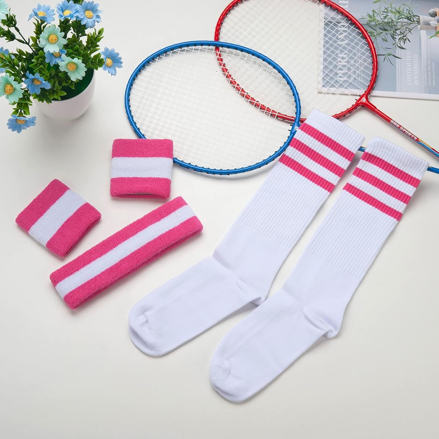 Juego de 5 bandas para el sudor y calcetines a rayas, bandas para el sudor, calcetines altos a rayas, para hombres y mujeres, deportes y fiestas de los años 80