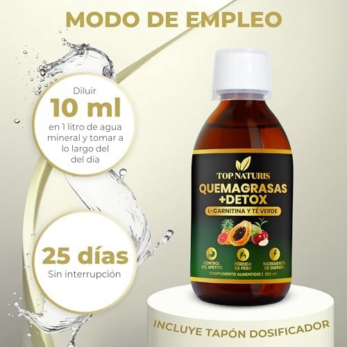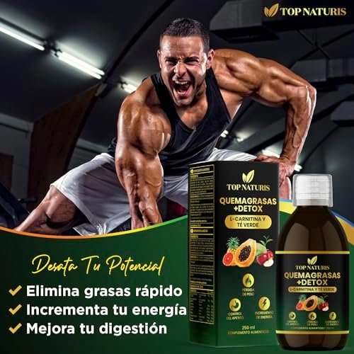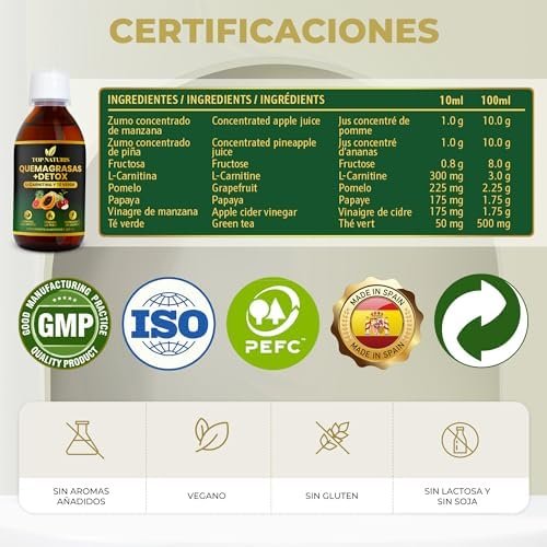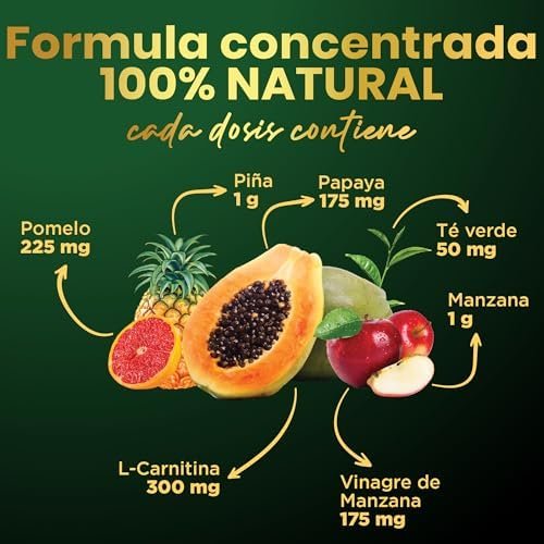 Acerca de este producto QUEMAGRASAS POTENTE Y ADELGAZANTE NATURAL: La combinación de ingredientes como el Té verde, la L-Carnitina y el pomelo tiene un efecto sinérgico en el aumento del metabolismo, aumentando la energía y la función muscular, facilitando la quema de grasas y favoreciendo rápidamente la pérdida de peso. DIGESTIÓN SALUDABLE, DRENANTE Y DIURÉTICO: La piña y la papaya contienen enzimas digestivas naturales, como la bromelina y la papaína que facilitan la digestión y actúan como diurético natural depurativo, ayudando a aumentar la producción de orina y a perder líquidos, reduciendo la grasa abdominal y consiguiendo un cuerpo fitness. DETOX y ANTIOXIDANTE: Gracias a su fórmula natural en jarabe liquido de rápida asimilación a base de frutas ricas en vitaminas y el Té verde (Estandarizado en un mínimo de 40% en polifenoles y un 20% en Catequinas) contribuyen a combatir el estrés oxidativo en el cuerpo, neutralizando los radicales libres y contribuyendo así a la protección celular y estimulando la producción de colágeno para una piel saludable. CONTROL DEL APETITO: La manzana y el Vinagre de Manzana potencian la sensación de saciedad y ayudan a mantener los niveles de azúcar en sangre, ayudando a controlar las ganas de comer. PRODUCTO DE ALTA CALIDAD CON INGREDIENTES NATURALES: En envase de vidrio para una mejor conservación de las propiedades, tapón dosificador y estuche protector con certificado PEFC. Producto oficialmente notificado, estudiado y aprobado por el Ministerio de Sanidad de España. 100% Vegano, Sin Gluten, Sin Lactosa, Sin Soja, Sin Azúcar, Sin aromas añadidos, No transgénico (GMO Free) y fabricado en España bajo certificados GMP e ISO. › Ver más detalles