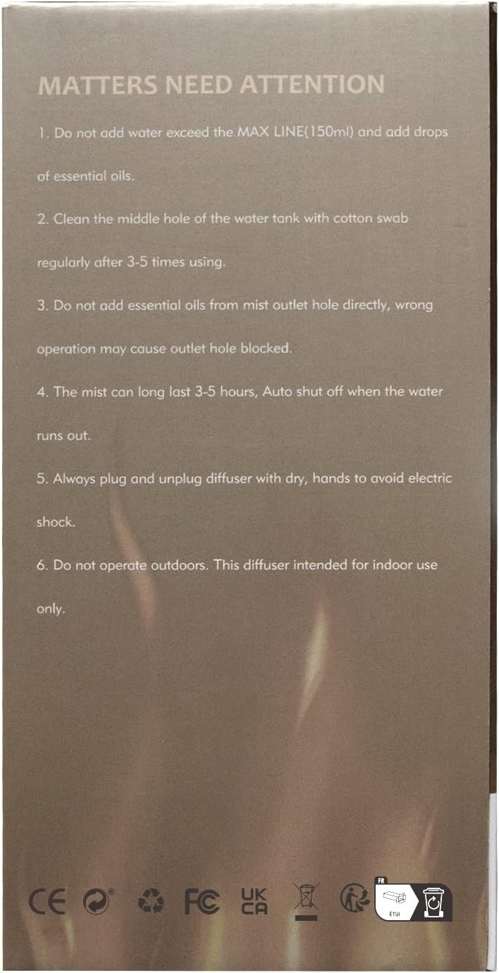 Ce diffuseur dâhuile essentielle avec effet flamme est tout simplement magnifique ! Non seulement il diffuse parfaitement les huiles essentielles, remplissant la pièce dâun parfum agréable et apaisant, mais son effet flamme ajoute une touche de chaleur et de confort à lâatmosphère. Lâéclairage imite vraiment une flamme douce, créant une ambiance relaxante, parfaite pour le soir ou les moments de détente.Le design est élégant et sâintègre bien dans nâimporte quel décor. Le réservoir dâeau a une bonne capacité, ce qui permet de profiter de longues heures de diffusion sans avoir à le recharger constamment. De plus, il est très silencieux, ce qui le rend idéal pour une utilisation dans une chambre à coucher ou un salon. En résumé, câest un excellent achat pour ceux qui cherchent à allier lâaromathérapie avec une ambiance visuelle apaisante. Je recommande vivement !