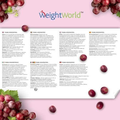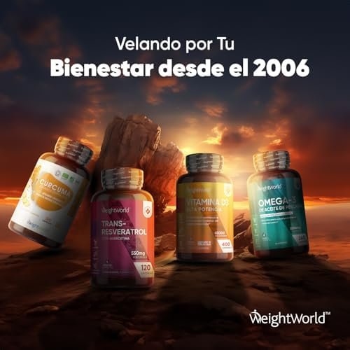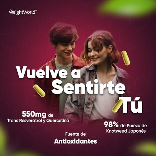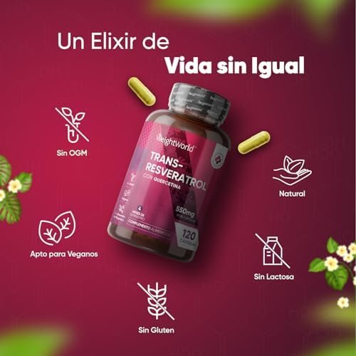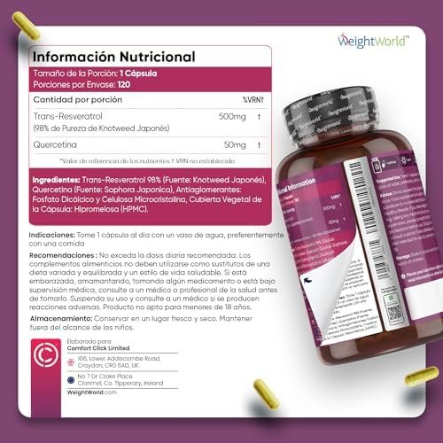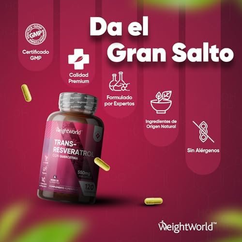 Acerca de este producto ¿Por Qué Escoger el Trans Resveratrol en Cápsulas de WeightWorld? – Adéntrate en el mundo de este polifenol, la forma activa del resveratrol que el cuerpo utiliza y absorbe mejor y conocido como una gran fuente antioxidante. Con un resveratrol de 500mg de potencia y quercetina (50mg), disfrutarás de un antioxidante en cápsulas proveniente de la planta Knotweed Japonés. Fuente de Antioxidantes de Origen Natural – El resveratrol trans brinda numerosos beneficios a la salud y destaca por ser uno de los nutrientes con una de las fuentes naturales más potentes de antioxidantes, vitamina C y vitamina E. ¡Cuídate por dentro para que se note por fuera! Acompaña tu rutina diaria y dieta con las cápsulas de antioxidantes y experimenta el cambio. Un Equipo Infalible con la Quercetina – El resveratrol puro se une a las grandes propiedades de la quercetina en este complemento. Esta consiste en un flavonoide obtenido de plantas y alimentos, ofreciendo una alta biodisponibilidad en su forma más pura. Nuestra quercetina se deriva del extracto de flor de la Sophora Japónica, nativa del este de Asia. Déjate cautivar por la fórmula definitiva. Cápsulas Sin Gluten, Veganas, Sin OGM y Sin Estearato de Magnesio – Nos enorgullecemos de poderte ofrecer este suplemento de resveratrol natural y quercetina sin aditivos artificiales. Asimismo, es apto para una variedad de dietas, incluyendo la vegana, sin lactosa, sin gluten y keto. Disfruta de un complemento altamente concentrado (550 mg) diseñado para tu día a día durante 4 meses. ¿Cuál es la Historia de WeightWorld? – WeightWorld es una pequeña empresa familiar con más de 18 años de experiencia. En todos estos años nos hemos convertido en una marca de referencia en suplementos alimenticios, vitaminas y minerales. Además todos nuestros productos utilizan ingredientes de gran calidad y con los estándares de fabricación GMP. › Ver más detalles