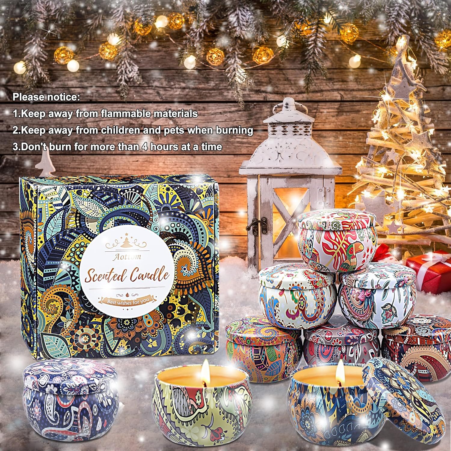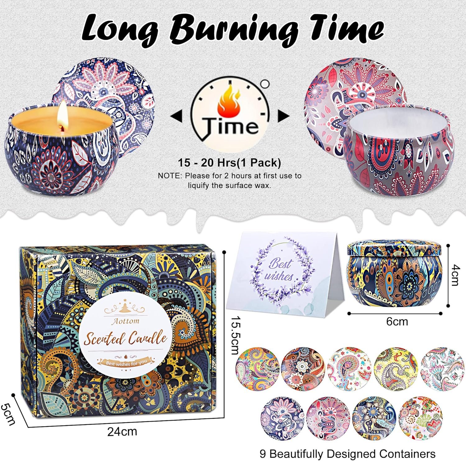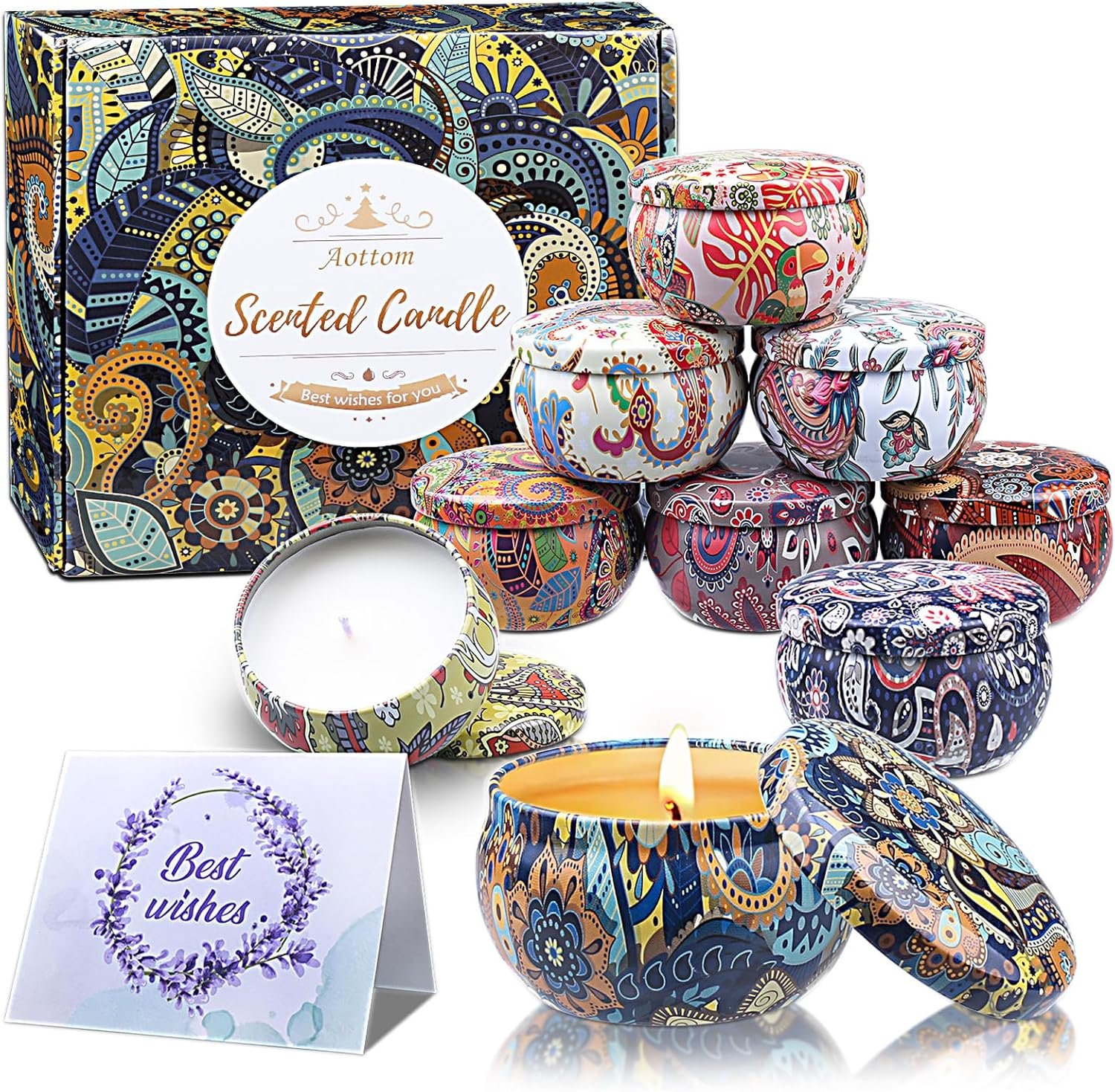 These candles are in a sturdy but beautiful box and the well made tins have colourful graphics. I havenât lit any of the candles as this is to be a gift but the scents coming from the box are really pleasing. My friend is going to love these candles.Very good value for money; thereâs even a gift tag included. Will definitely buy again.