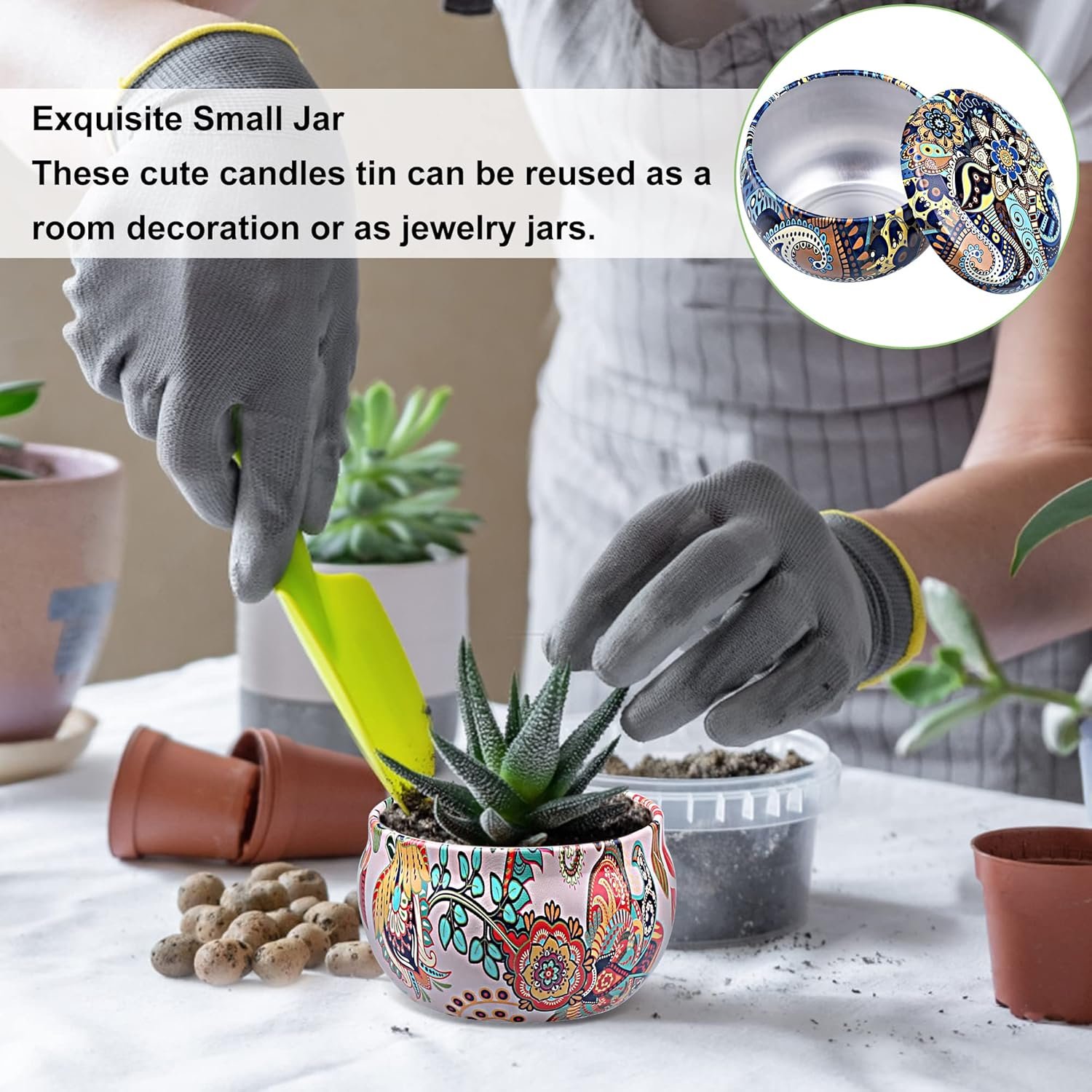 🌸 Portátil y reutilizable 🌸 Los portavelas de aromaterapia son hermosos, están sellados y son portátiles. Las latas se pueden reciclar una vez quemadas por completo, se pueden usar para plantar plantas, decorar su hogar y ser un excelente contenedor de almacenamiento para algunos artículos pequeños, como anillos, collares, auriculares, etc.