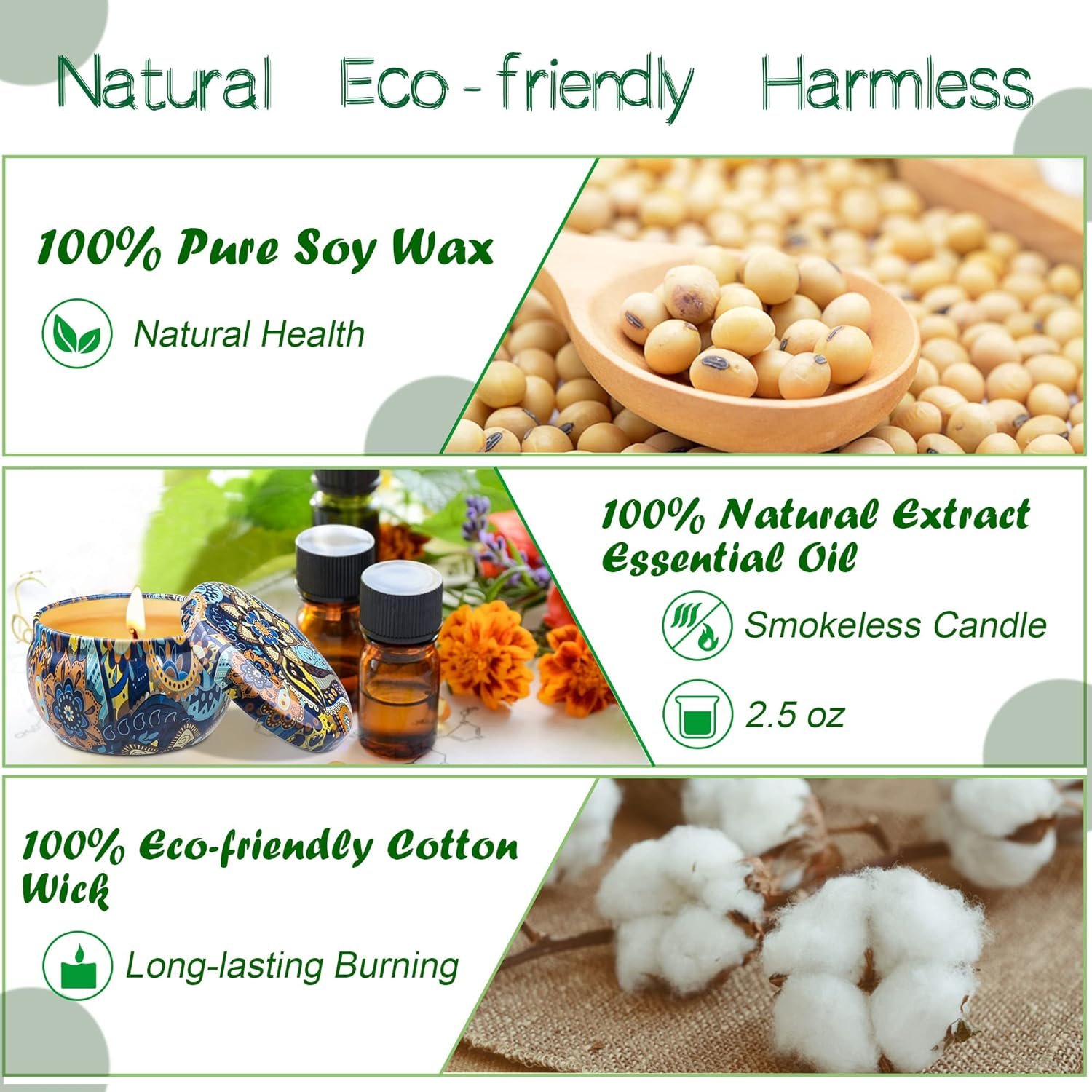 🌸 Largo Tiempo de Combustión 🌸 Cada vela con aroma a soya es de 2.5 oz. Cada vela puede quemar de 15 a 20 horas, el tiempo total de combustión es de hasta 135 a 180 horas, lo que ayuda a relajar el cuerpo y purificar el aire.