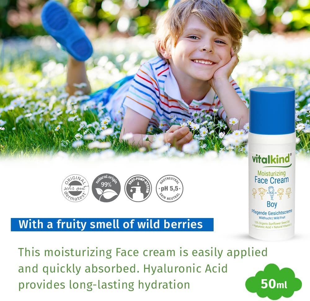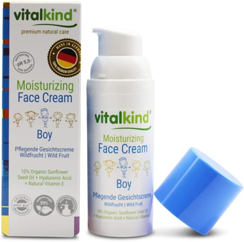 vitalkind Crema facial hidratante para niños, cosmética natural premium para niños de vitalkind. Crema facial nutritiva con 99% de ingredientes de origen natural.