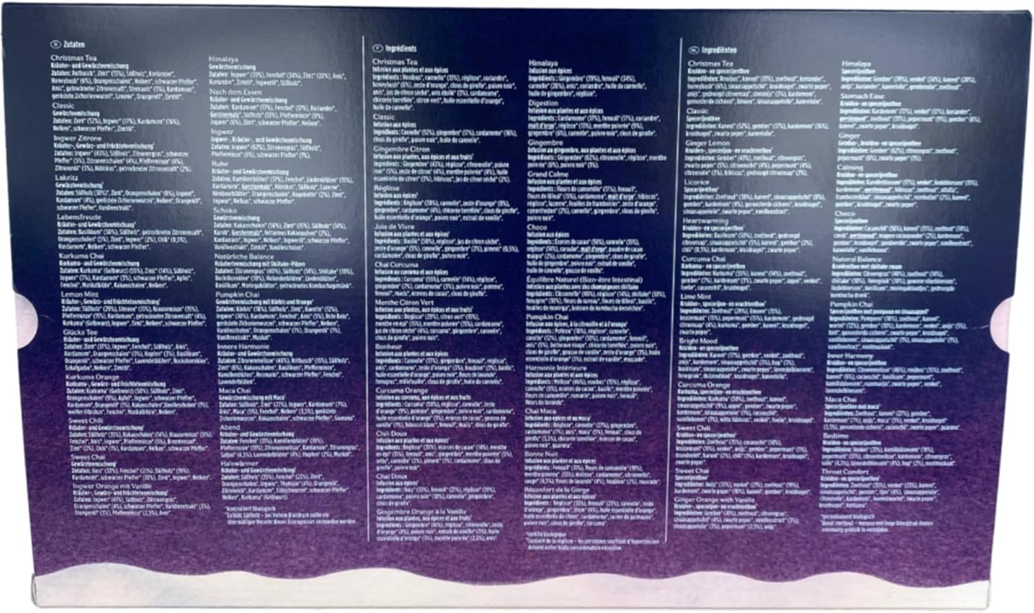 24 tipos de té diferentes: cada día de diciembre te sorprende con un nuevo sabor especial. Ya sea que te gusten los sabores picantes, afrutados o florales, el calendario de Adviento ofrece una diversidad de tés para adaptarse a tu estado de ánimo y momento.