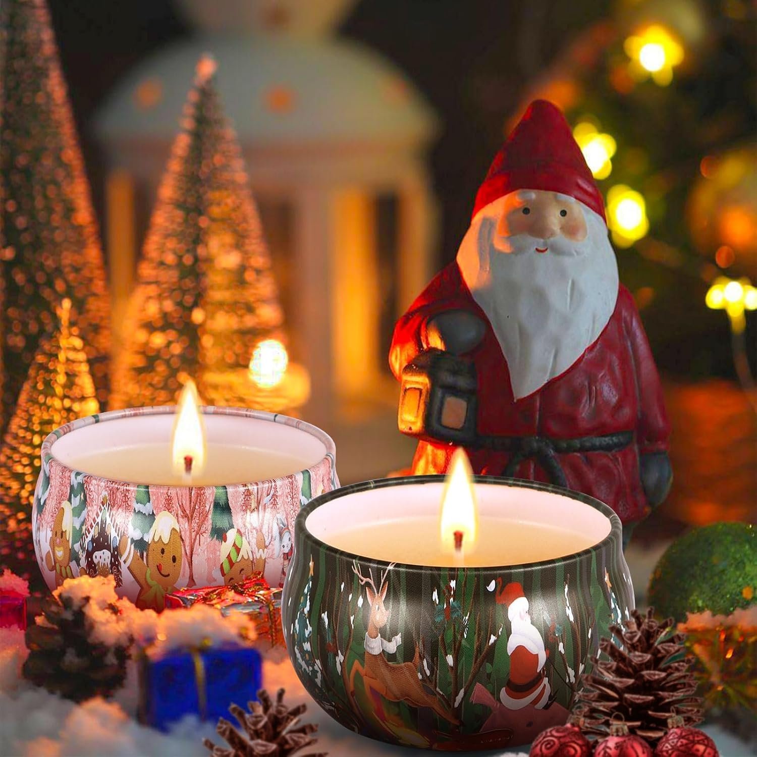 🎅【Embalaje Reutilizable】: Las velas están empaquetadas en latas y decoradas con hermosos motivos artísticos. Luego de una combustión completa, estas latas pueden ser reutilizadas para almacenar algunos de sus artículos o plantar algunas plantas suculentas para decorar el ambiente.