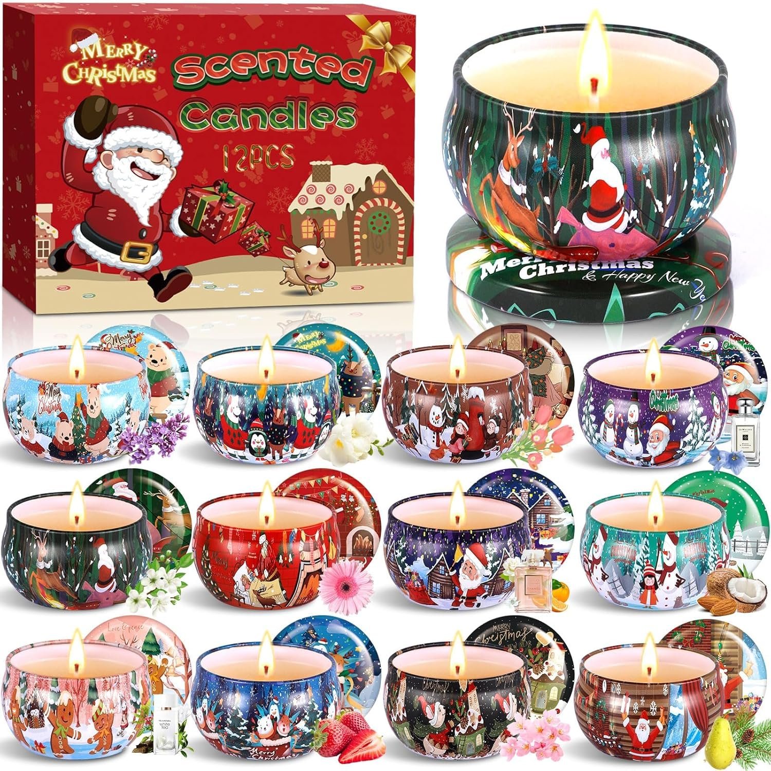 🎅【12 Fragancia Agradable de Larga Duración】: Lavanda, fresa, coco y nueces, fresia, manzanilla, primavera, flor de cerezo, cedro y pera inglesa, té blanco, campanilla silvestre Jo Malone, gardenia, coco. Cera de soja naturales emiten una fragancia agradable cuando se queman y tienen los efectos de nervios calmantes,purificación del aire y eliminación de olores.